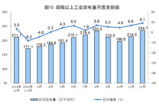 電力生產(chǎn)增速繼續(xù)加快。12月份,發(fā)電量7277億千瓦時,同比增長9.1%,增速比上月加快2.3個百分點(diǎn);日均發(fā)電234.7億千瓦時,環(huán)比增加20.7億千瓦時。2020年,發(fā)電量74170億千瓦時,比上年增長2.7%。