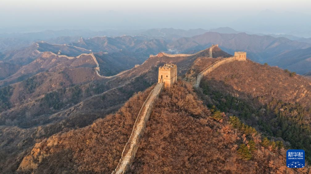 11月15日拍摄的晨光映照下的河北省承德市滦平县金山岭长城(无人机照片)。