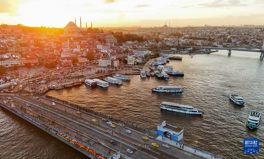 11月24日,夕阳的光辉照耀在土耳其伊斯坦布尔金角湾的水面上。