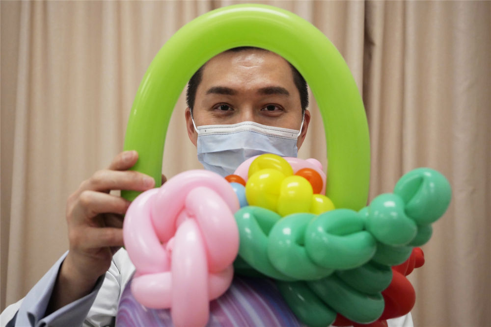 陳諾文是東區(qū)醫(yī)院的兒童及青少年科副顧問醫(yī)生。之前,為了拉近與小患者的距離,陳諾文不時(shí)親手制作氣球卡通玩偶送給他們,因而練就純熟的氣球“手藝”,被小患者們親切地稱為“氣球大夫”。疫情暴發(fā)后,他總想看看有什么地方能幫得上忙,為抗疫加油。沒想到,氣球“手藝”就這樣派上了用場(chǎng)。