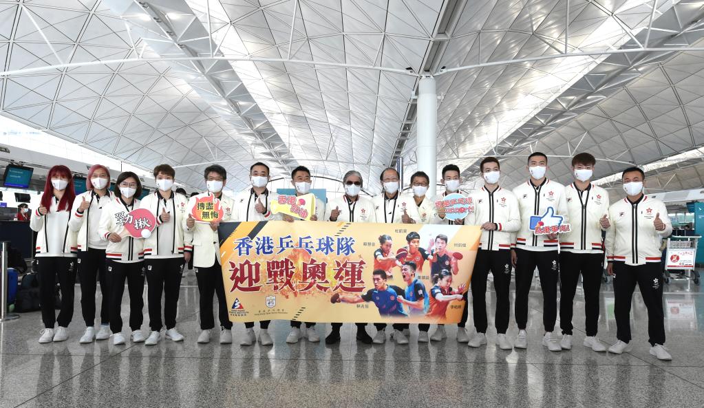 7月17日,中國香港體育協(xié)會暨奧林匹克委員會會長霍震霆(中)、中國香港代表團團長貝鈞奇(右七)與中國香港乒乓球隊教練及運動員合影。當(dāng)日,中國香港代表團從香港國際機場出發(fā)參加?xùn)|京奧運會。據(jù)悉,中國香港代表團將有46名運動員參加?xùn)|京奧運會38個小項的爭奪。新華社記者盧炳輝攝