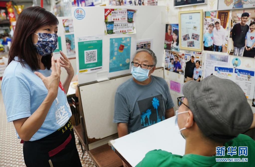 在香港鯉魚門“銀龍咖啡茶座”餐廳,女老板李凱瑚(左)在和店內食客聊天(7月26日攝)。新華社記者 王申 攝