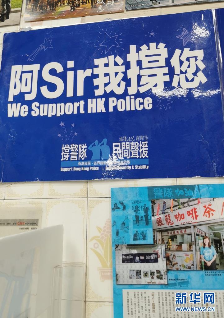香港鯉魚門“銀龍咖啡茶座”餐廳內張貼著許多撐警的海報,這張海報是2019年6月30日李凱瑚從萬人撐警大會上領回的(7月26日攝)。 新華社記者 陸敏 攝