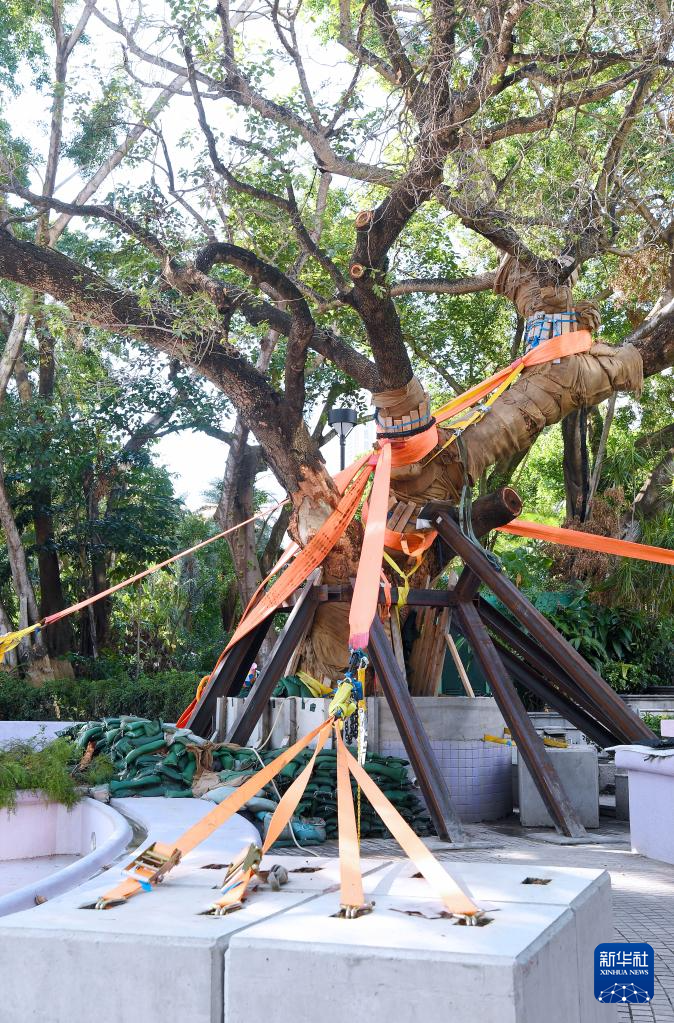 在香港九龙公园喷泉旁,一棵历经风雨的大叶合欢古树依然挺立,绑带缠绕的树干在阳光下透着不屈的韧性。