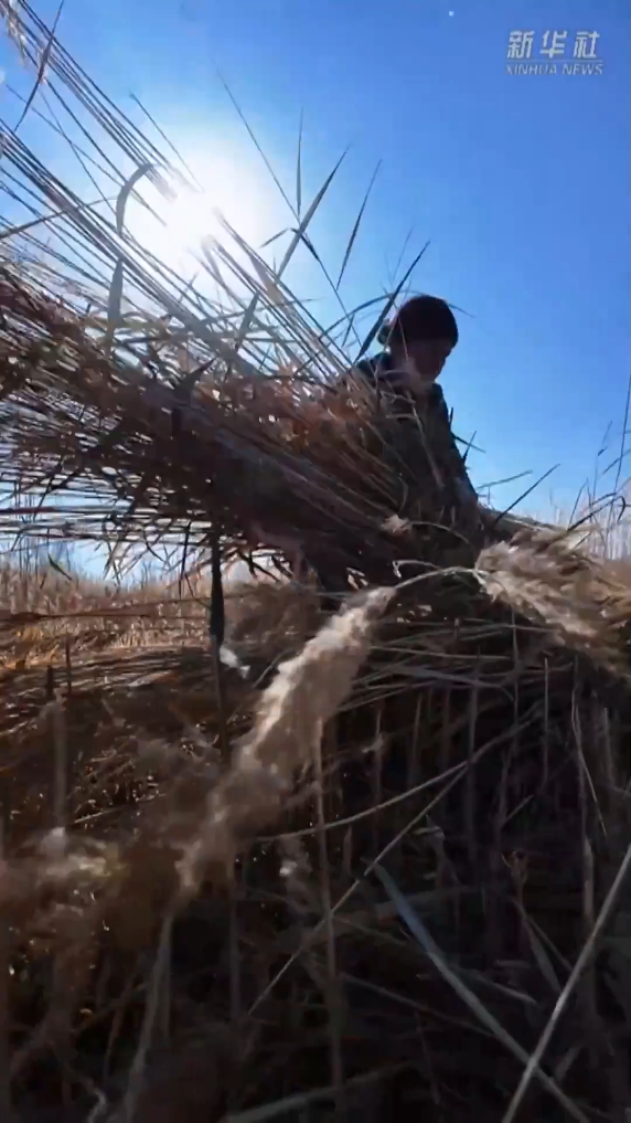 在塔克拉玛干沙漠南缘的皮山县乔达乡巴什拉克村,村民图尔荪江·亚森和乡亲们正弯腰忙碌,手中的镰刀一起一落,成片的芦苇被整齐割下、捆扎。