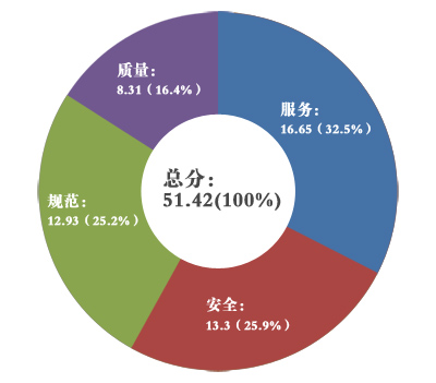 3、通過問卷調(diào)查結(jié)果分析,金隅項(xiàng)目總分共51.42,其中服務(wù)占總比例32.50%,安全占總比例25.90%,規(guī)范占總比例25.20%,質(zhì)量占總比例16.40%。