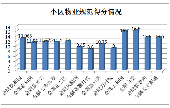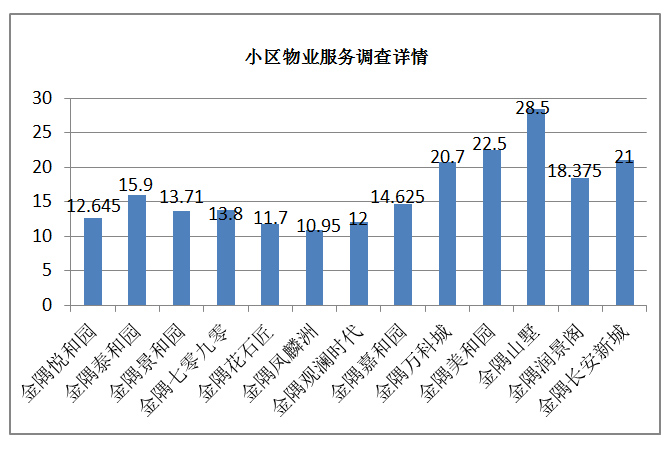 由上圖顯示,在目前的物業(yè)服務(wù)調(diào)查過程中,,有金隅項(xiàng)目得分最高,為28.5分,金隅觀瀾時(shí)代得分最低,為12分。