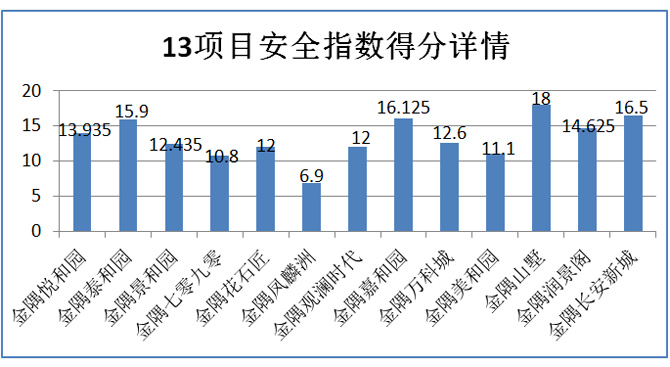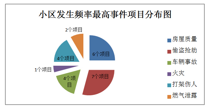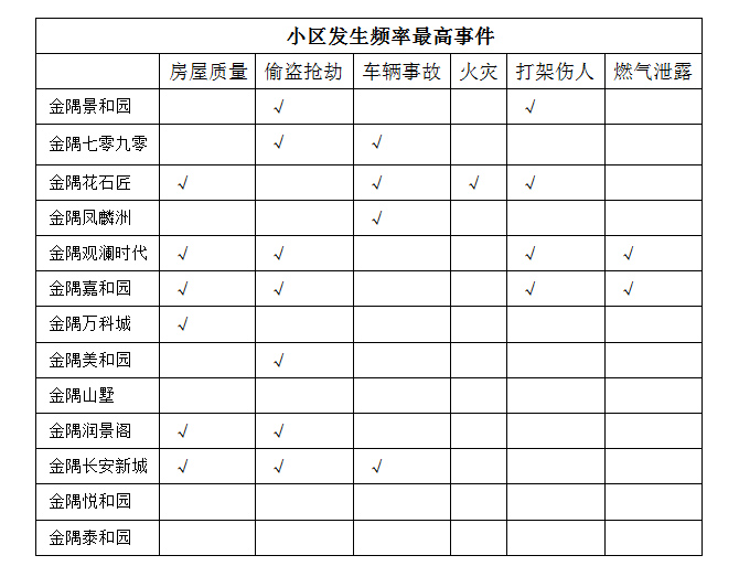 根據(jù)上述兩個(gè)表格發(fā)現(xiàn),整體來看,金隅各小區(qū)安全隱患較多,13個(gè)項(xiàng)目中共10個(gè)項(xiàng)目存在安全隱患,占77%。其中偷盜搶劫比例最多,占54%,其次為房屋質(zhì)量,占46%,項(xiàng)目中金隅花石匠、金隅觀瀾時(shí)代、金隅嘉和園三個(gè)項(xiàng)目問題比較多。
