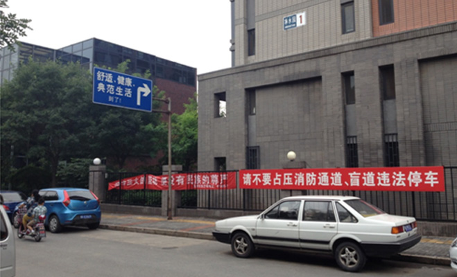 而對(duì)于購買了私家車的業(yè)主而言,每天進(jìn)出小區(qū)也不太方便。記者注意到,盡管嚴(yán)禁占用消防通道的橫幅懸掛在凈水東路兩側(cè),但是,這里依然幾乎停滿了私家車,還有幾輛為了節(jié)約空間,橫著停放在行人道上。
