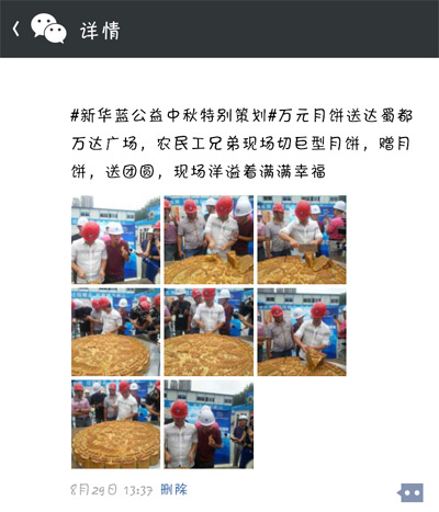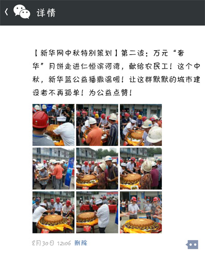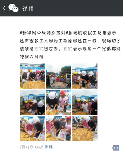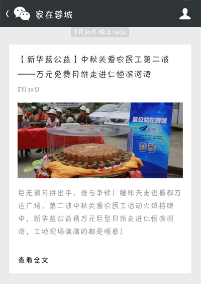 為了給這些身在異鄉(xiāng)的農(nóng)民工兄弟送去溫暖,新華藍(lán)公益特別為他們舉辦了一場(chǎng)“中秋關(guān)愛農(nóng)民工特別活動(dòng)”,現(xiàn)場(chǎng)為工人捐贈(zèng)月餅。8月29日上午10:30,本次活動(dòng)在成都沙灣會(huì)展中心如期啟動(dòng)。