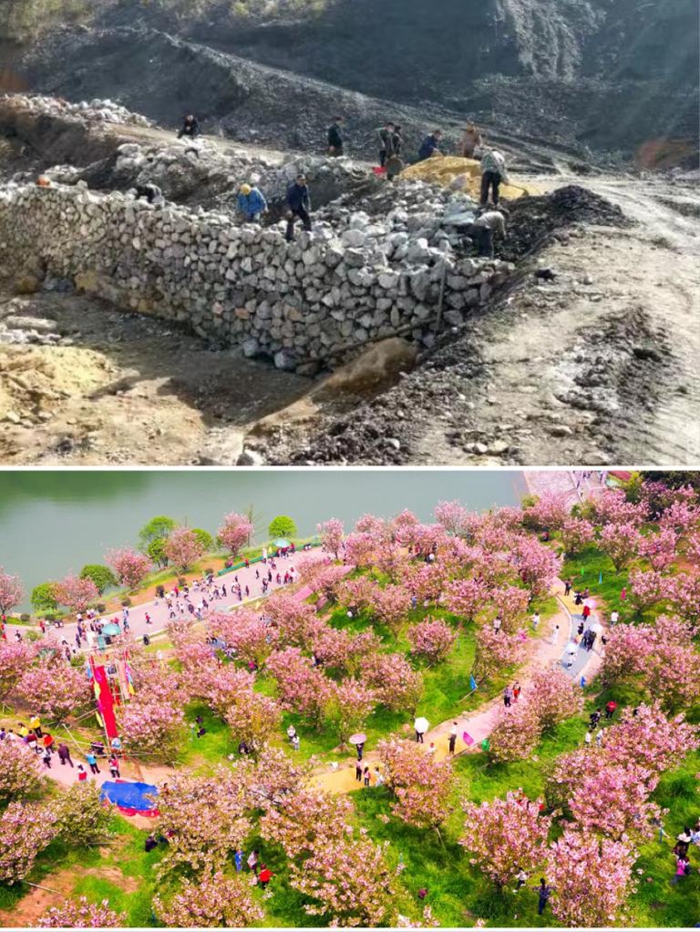 拼版圖片:上圖,安源區(qū)城郊管委會略下村生態(tài)修復(fù)前礦山裸露;下圖,生態(tài)修復(fù)后“陽光花?!本跋蟆#ㄆ监l(xiāng)市委宣傳部供圖)