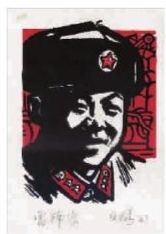 ????后來他家搬去了蘇州河畔的“半島”,我去得就少了。那時老先生名重繪畫界。但是每有版畫活動,先生年長了,還是坐著輪椅來參觀?!叭嗣馈背霭媪怂漠嫾业剿铱吹搅诉@本版畫集,其中有老先生六十年創(chuàng)作的版畫“雷鋒像”?!翱痰谜婧?,”我對著這一頁看了好久,“我想得到這張雷鋒像?!崩舷壬f“怎么你要這個”?我便把自己平日里喜歡學雷鋒的故事講給他聽,他點點頭。便送了我這張簽名的“雷鋒像”。