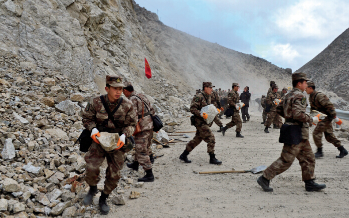 On April 26, soldiers clear a landslide-clogged road 5 kilometers from Tibet’s Nyalam County.