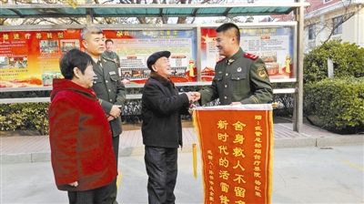 12月9日,孫書偉老人(右二)趕到武警煙臺療養(yǎng)院,將致謝錦旗送給楊紅榮(右一)。