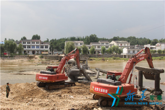 在湖北紅安七里坪鎮(zhèn),武警交通二總隊(duì)官兵拆除損毀的橋梁。