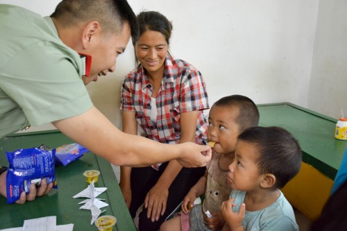 圖為邊防官兵給彝族小朋友零食吃