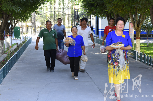 ????“你們平時(shí)執(zhí)勤都那么忙,每次叫你們?nèi)ノ曳孔映灶D飯都不去,現(xiàn)在總可以嘗一嘗我親手做的馓子了吧”帕提曼手拿著一把馓子遞給了桌旁的民警小王,這是發(fā)生在2017年7月26日三道河邊防派出所里的一幕,為了慶祝即將到來(lái)的建軍90周年,帕提曼與霍城縣三道河鄉(xiāng)五隊(duì)的村民帶著一些自家的東西去慰問(wèn)邊防派出所的官兵,他們都有一個(gè)特殊的身份——新疆邊防總隊(duì)伊犁邊防支隊(duì)三道河邊防派出所官兵們的結(jié)對(duì)親戚們。