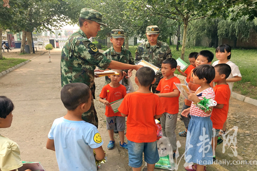 圖為秦皇島公安邊防支隊卸糧口邊防派出所官兵為孩子們分發(fā)書本