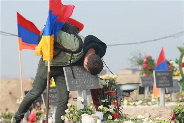 ????資料圖片:在亞美尼亞首都埃里溫一處公墓,當(dāng)?shù)孛癖姲苍嵩诩{卡沖突中陣亡的士兵