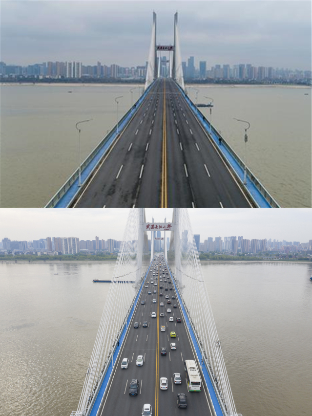 ▲上圖為2020年1月27日的武漢長江二橋。來源:中國日報;下圖為2020年4月14日的武漢長江二橋。新華社記者 才揚 攝