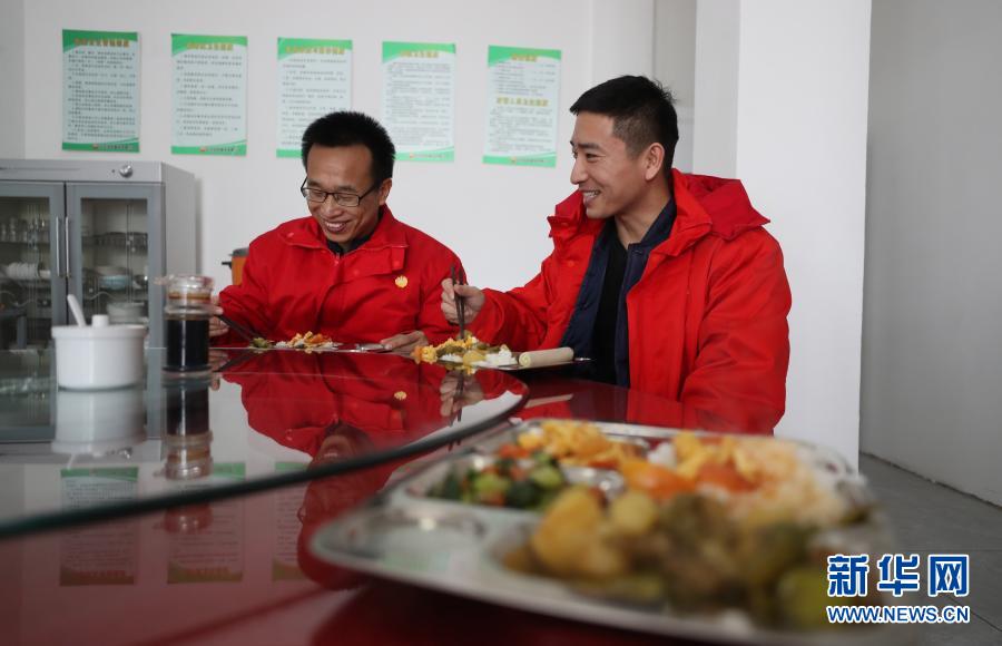 2月3日,在遼河油田建設(shè)有限公司管道第三項(xiàng)目部,來(lái)自河北衡水的概預(yù)算管理人員王殿凱(左)和來(lái)自河北邢臺(tái)的工程技術(shù)人員張浩在食堂吃飯。今年他們都留在當(dāng)?shù)剡^(guò)年。