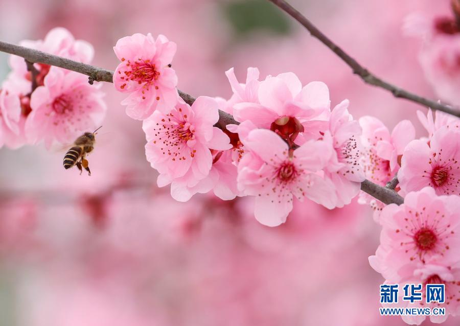 在浙江景寧畬族自治縣,蜜蜂在盛開的梅花旁飛舞(2月14日攝)。新華社發(fā)(李肅人 攝)