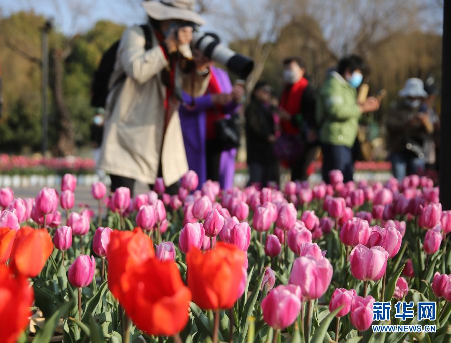 2月14日,游客在昆明市大觀公園拍攝盛開(kāi)的郁金香。新華社發(fā)(梁志強(qiáng) 攝)