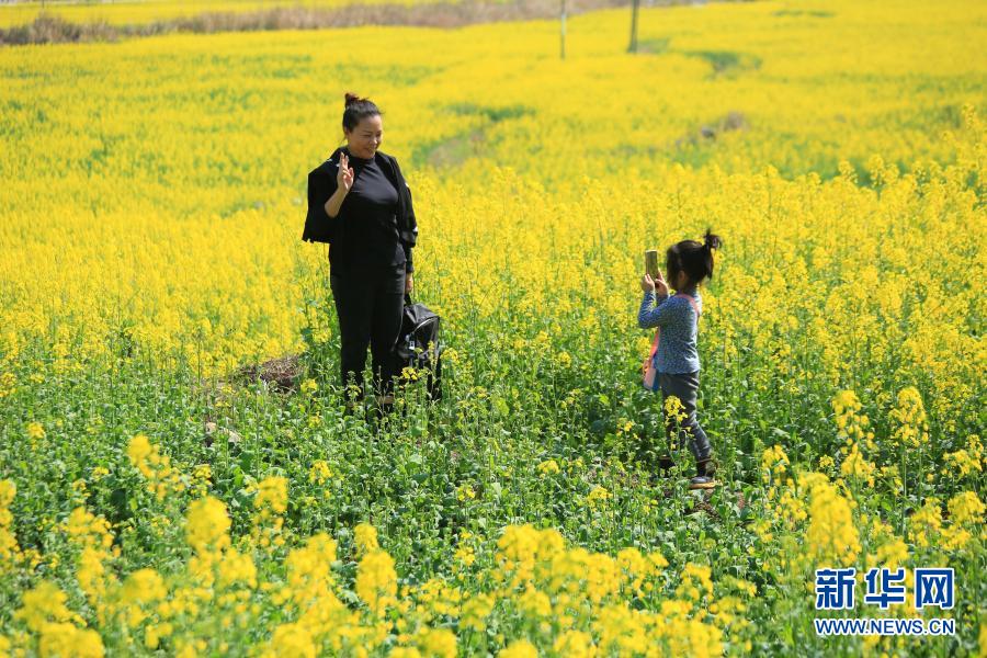 2月14日,在貴州省黔東南苗族侗族自治州黎平縣,游人在油菜花田賞花游玩。新華社發(fā)(徐基茂 攝)