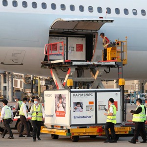 2月19日,在香港國(guó)際機(jī)場(chǎng),工作人員將裝載疫苗的貨柜箱送往指定地點(diǎn)進(jìn)行儲(chǔ)存。新華社記者 李鋼 攝