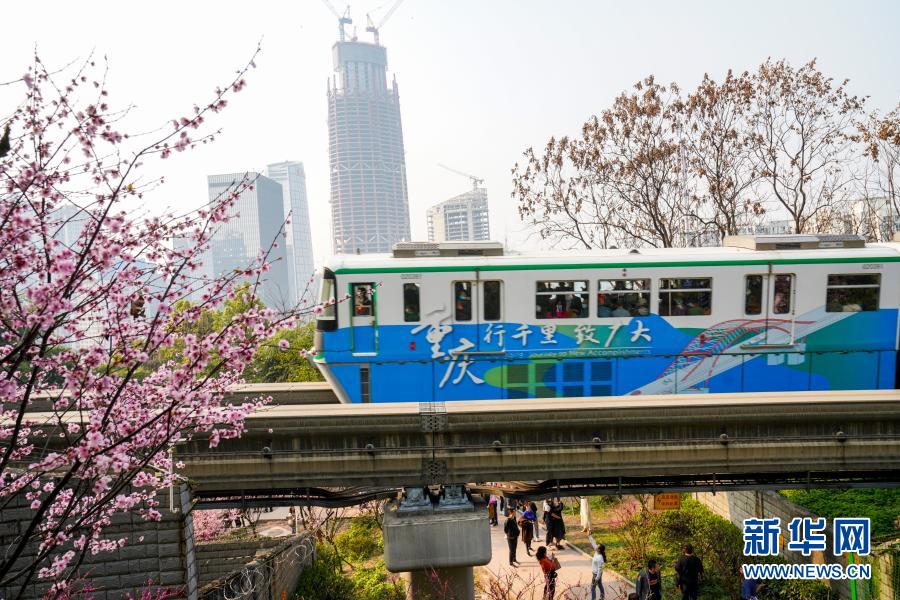 2月23日,在重慶軌道交通2號線佛圖關(guān)段,一列單軌列車穿越花海奔馳而過。