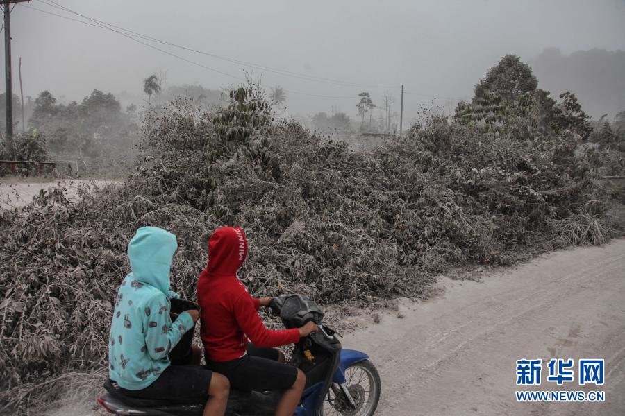 3月2日,印度尼西亞北蘇門(mén)答臘省卡羅的居民行駛在火山灰覆蓋的道路上。