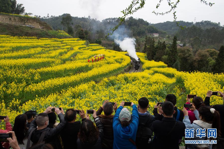 3月2日,一列嘉陽小火車經(jīng)過段家灣蜜蜂巖的油菜花海,吸引眾多游客拍照。