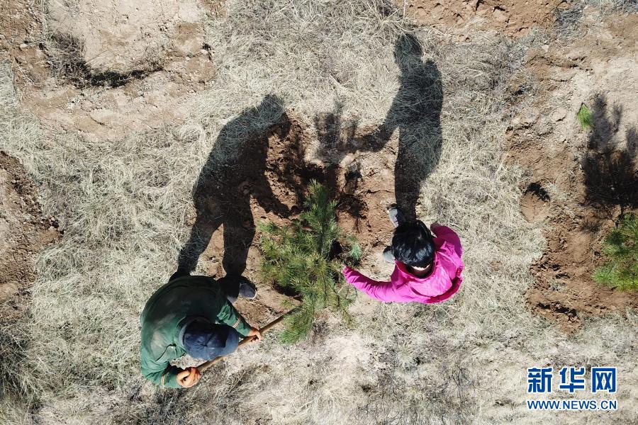 3月11日,在平?jīng)鍪嗅轻紖^(qū)白水鎮(zhèn)焦莊村北山,張文玉(右)現(xiàn)場(chǎng)指導(dǎo)工人種植油松(無人機(jī)照片)。