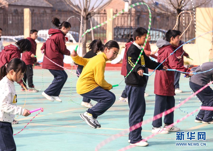 騎路小學的學生們在體育課上進行跳繩鍛煉(3月10日攝)。新華社記者 楊磊 攝