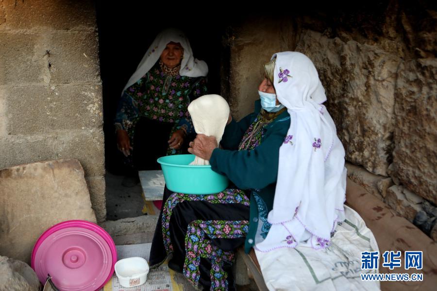 3月17日,78歲的拉比亞·阿布·卡巴什(右)和70歲的卡茲蘭·阿布·卡巴什在約旦河西岸城市希伯倫附近的一個村莊制作“塔本”烤餅。