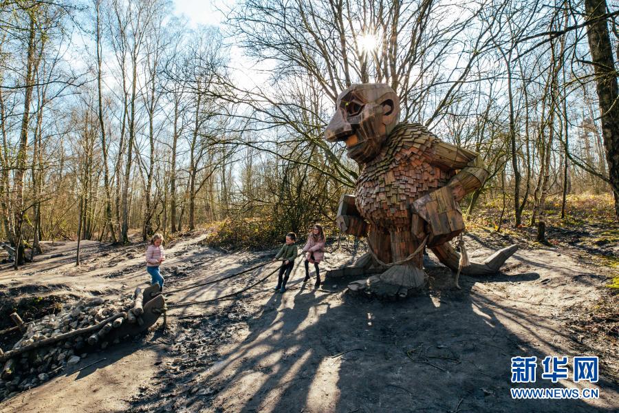 3月20日,孩子們?cè)诒壤麜r(shí)博姆市的德舒爾森林公園和一座“巨人”雕塑“玩耍”。新華社記者 張鋮 攝
