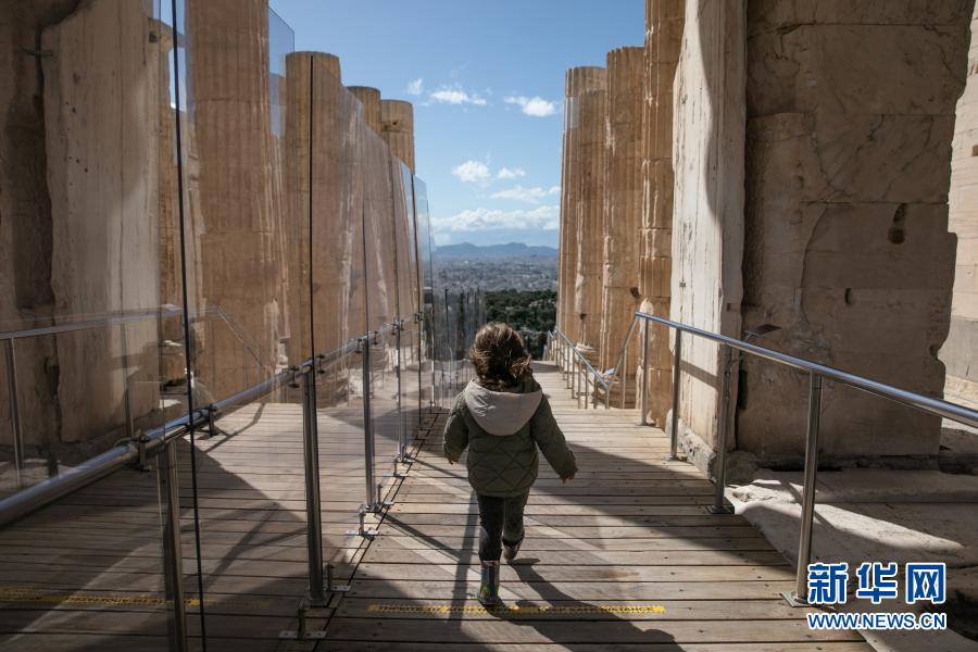 3月22日,一名游客游覽希臘雅典衛(wèi)城。希臘露天考古遺跡22日起恢復開放。游客需遵守保持社交距離和佩戴口罩等防疫規(guī)定。新華社發(fā)(萊夫特里斯·帕察里斯攝)