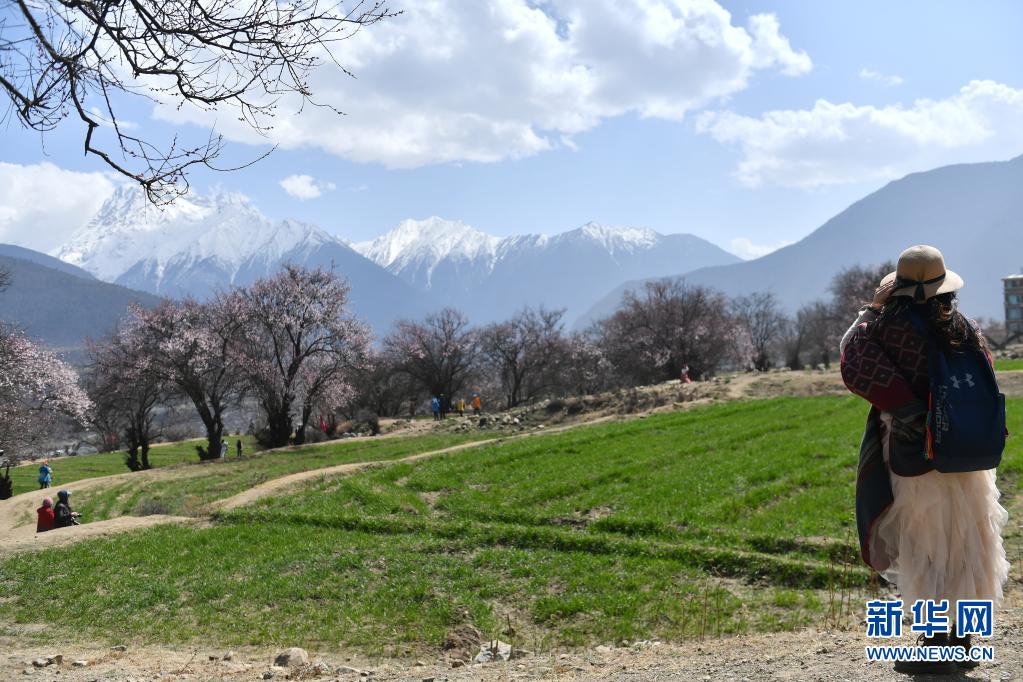 3月28日,游客們來到西藏自治區(qū)林芝市索松村欣賞桃花。新華社記者 孫瑞博 攝
