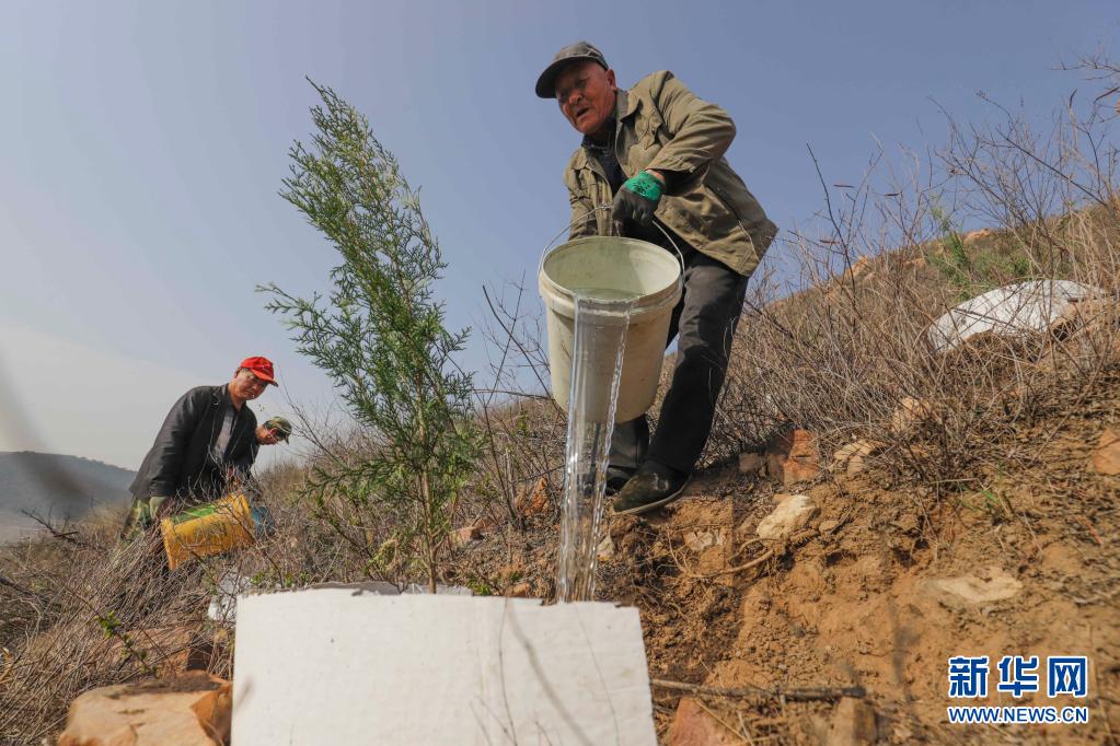 3月31日,造林隊員在河北省遵化市石門鎮(zhèn)金星山給新栽的樹苗澆水。