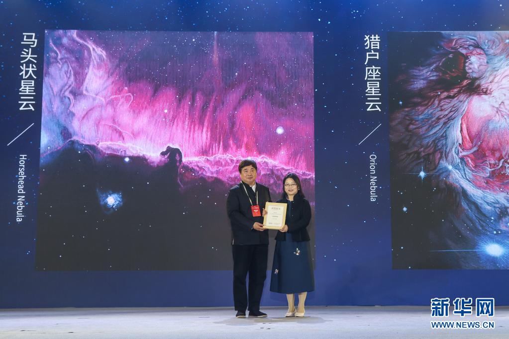 4月24日,在江蘇南京中國(guó)航天日主場(chǎng)活動(dòng)現(xiàn)場(chǎng),陳英華(右)的“星空”系列蘇繡作品獲得太空探索與藝術(shù)創(chuàng)想大賽特別獎(jiǎng)。新華社發(fā)(崔曉 攝)