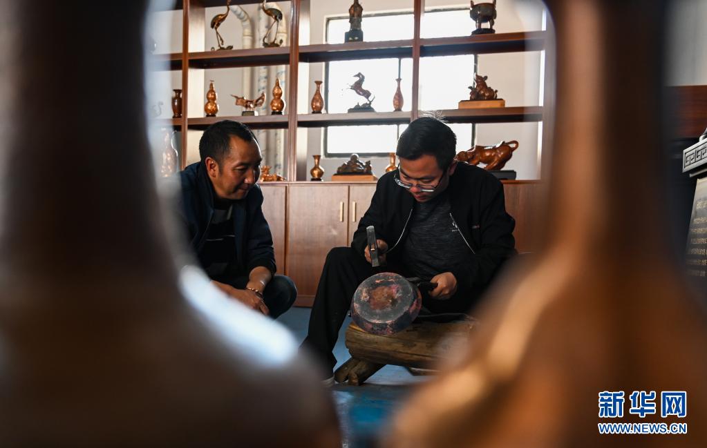 地處滇東北、烏蒙山腹地的云南會澤縣流傳著具有300多年歷史的斑銅制作工藝。斑銅工藝復雜,要采用高品位的銅為原料,經過20余道工序制作而成。產品“妙在有斑,貴在渾厚”,風格獨樹一幟。33歲的張偉是會澤“張氏斑銅”的第十三代傳人。自幼深受地域文化和家庭熏陶的他,大學畢業(yè)后,返鄉(xiāng)從事斑銅制作工作。在會澤古城的“銅匠街”,張偉創(chuàng)辦了斑銅傳習館,不斷研發(fā)斑銅新產品、傳承著這項非遺技藝?!鞍咩~是一種情感、一種文化,希望在我們這代人的努力下能夠更好地將它傳承下去,讓更多人了解斑銅的獨特魅力?!睆垈フf。