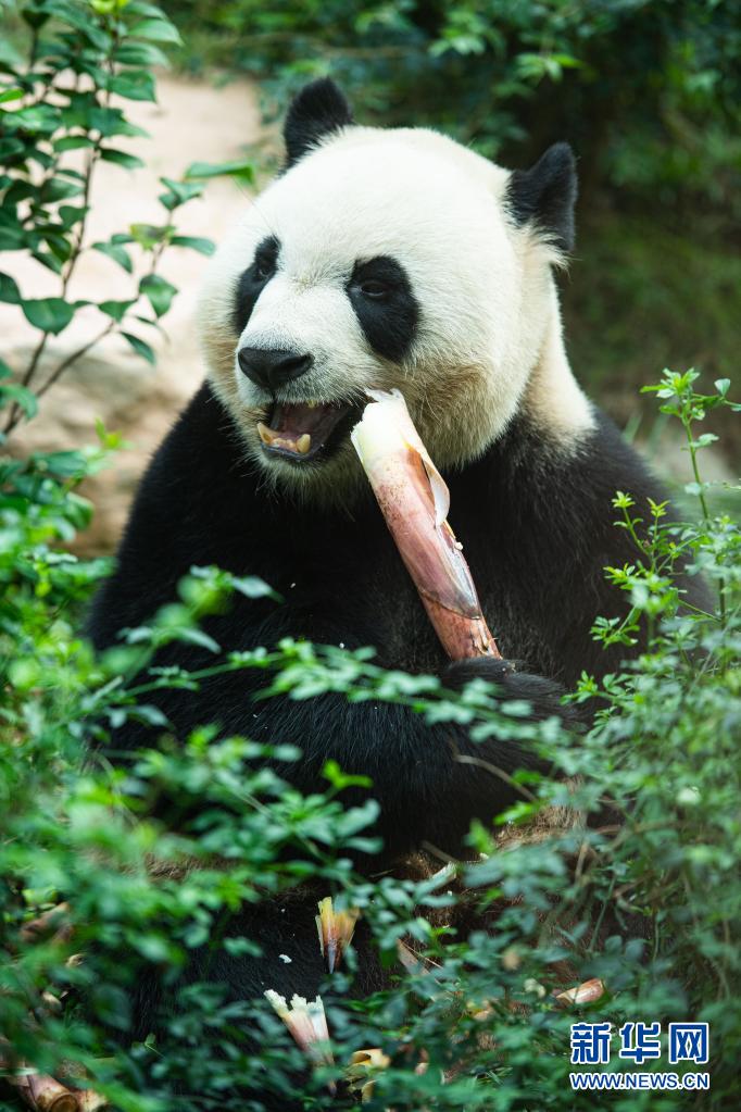 5月1日,大熊貓“健健”在吃竹筍。