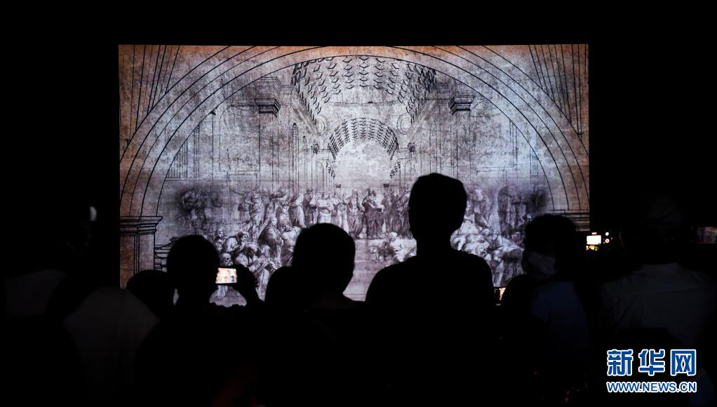 5月3日,觀眾在觀看拉斐爾作品《雅典學(xué)院》的數(shù)字媒體解析。