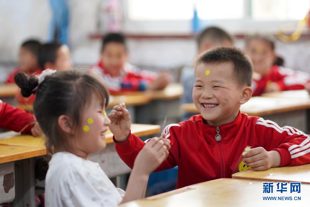 5月7日,河北省邢臺市內丘縣南賽中心小學的學生在教室做貼笑臉游戲。世界精神衛(wèi)生組織將每年的5月8日定為“世界微笑日”,希望通過微笑促進人類身心健康,增進社會和諧。新華社發(fā)(劉繼東 攝)