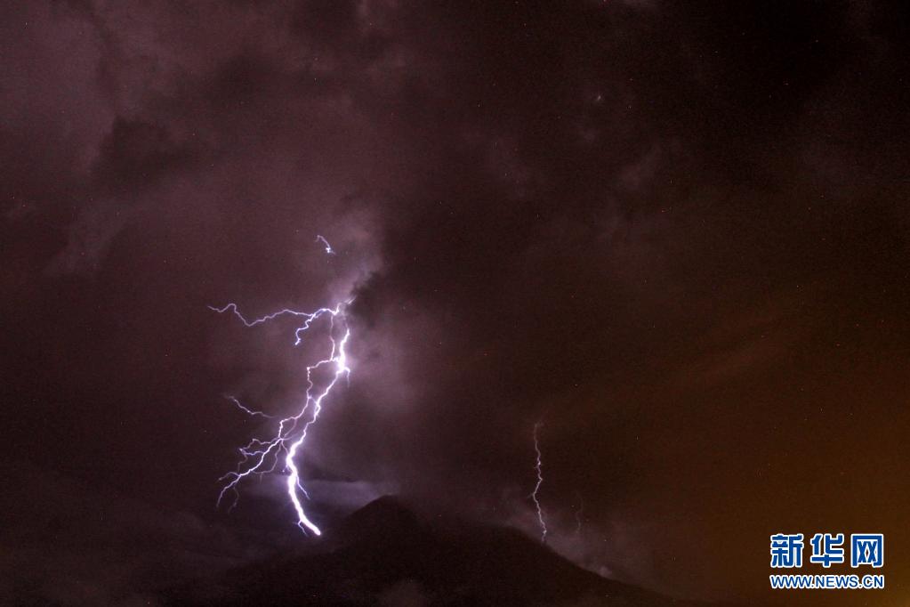 這是5月13日在印度尼西亞北蘇門答臘省拍攝的錫納朋火山上空的閃電(長時間曝光照片)。