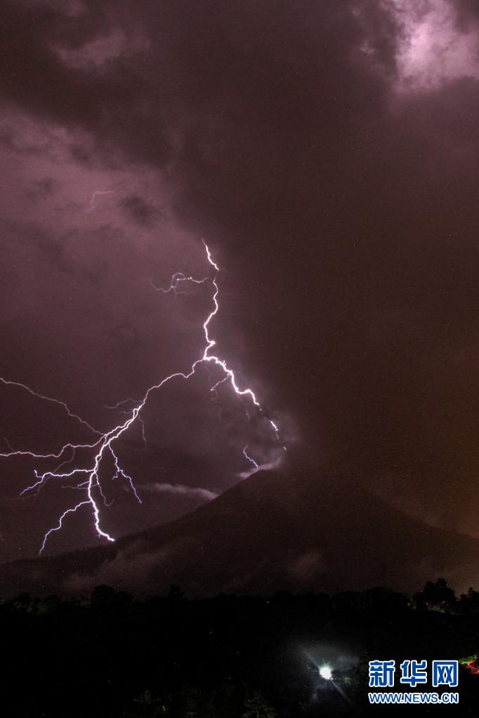 這是5月13日在印度尼西亞北蘇門答臘省拍攝的錫納朋火山上空的閃電(長時(shí)間曝光照片)。