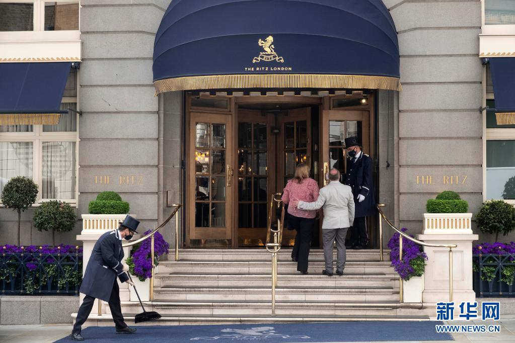 5月17日,工作人員在英國(guó)倫敦一家酒店門(mén)前迎接顧客。