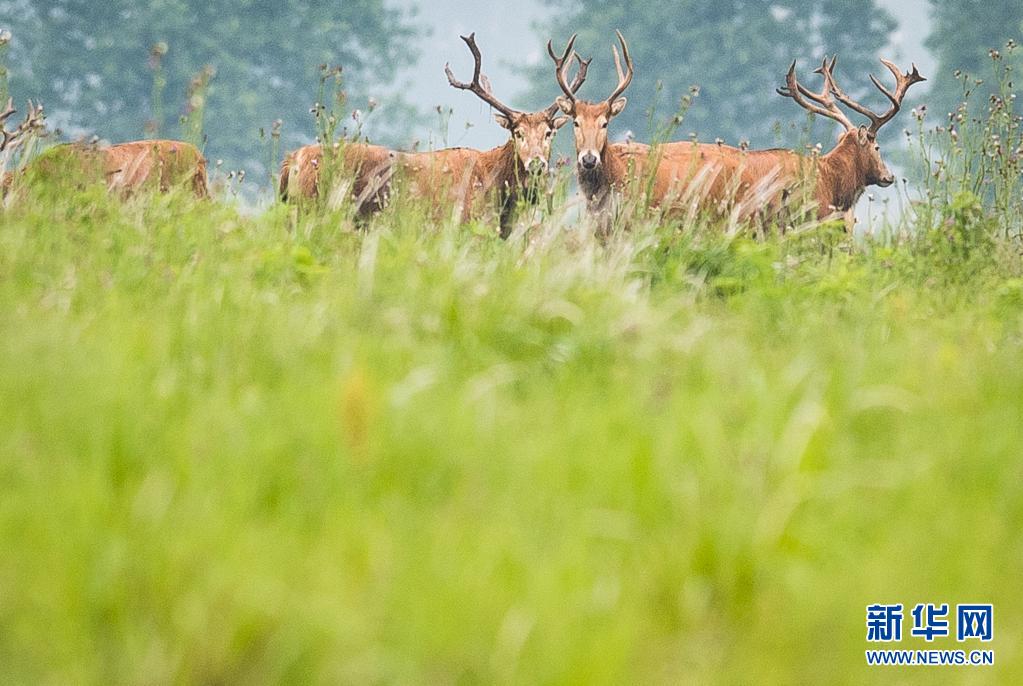 5月17日,一群麋鹿在石首麋鹿國家級自然保護區(qū)內活動。新華社記者 肖藝九 攝