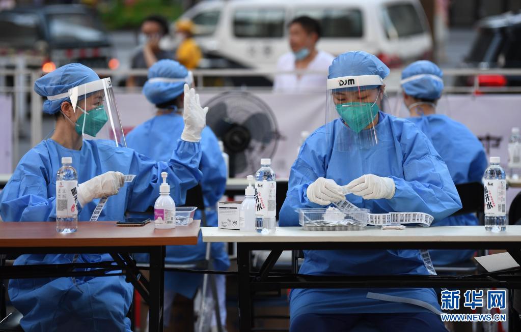 5月27日,在廣州荔灣區(qū)廣鋼新城核酸臨時采集點,南方醫(yī)科大學南方醫(yī)院的醫(yī)務人員進行檢測前的準備工作。新華社記者 鄧華 攝