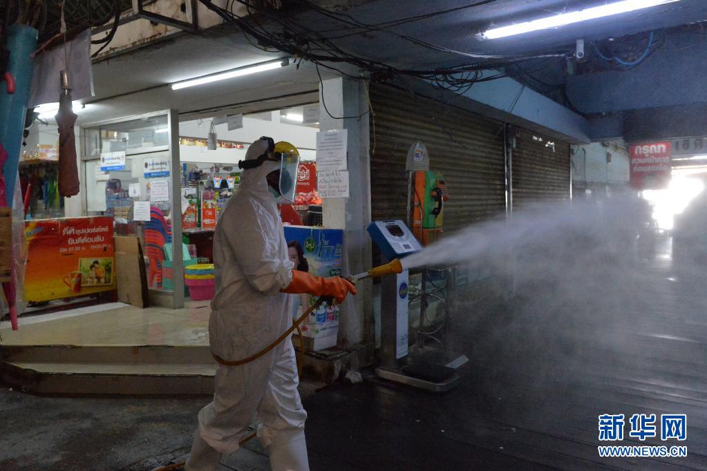 6月21日,工作人員在泰國首都曼谷一處生鮮市場進(jìn)行消毒。